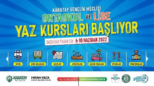 “Karatay Gençlik Meclisi Yaz Okulu” projesi bu yıl ilk kez ortaokul ve lise öğrencileri için ayrı ayrı olarak planlandı. https://yazkursu.karatay.bel.tr/ adresinden alınmaya başlanan Karatay Yaz Okulu, kontenjanlarla sınırlı olacak ve kurslar tamamen ücretsiz. Bu kapsamda Yaz Okulu’nun ortaokul öğrencileri için ayrılan bölümü için Karatay’da ikamet etmek şartıyla önümüzdeki eğitim yılında 5, 6, 7 ve 8. sınıfa başlayacak olan ortaokul öğrencileri başvurabiliyor.