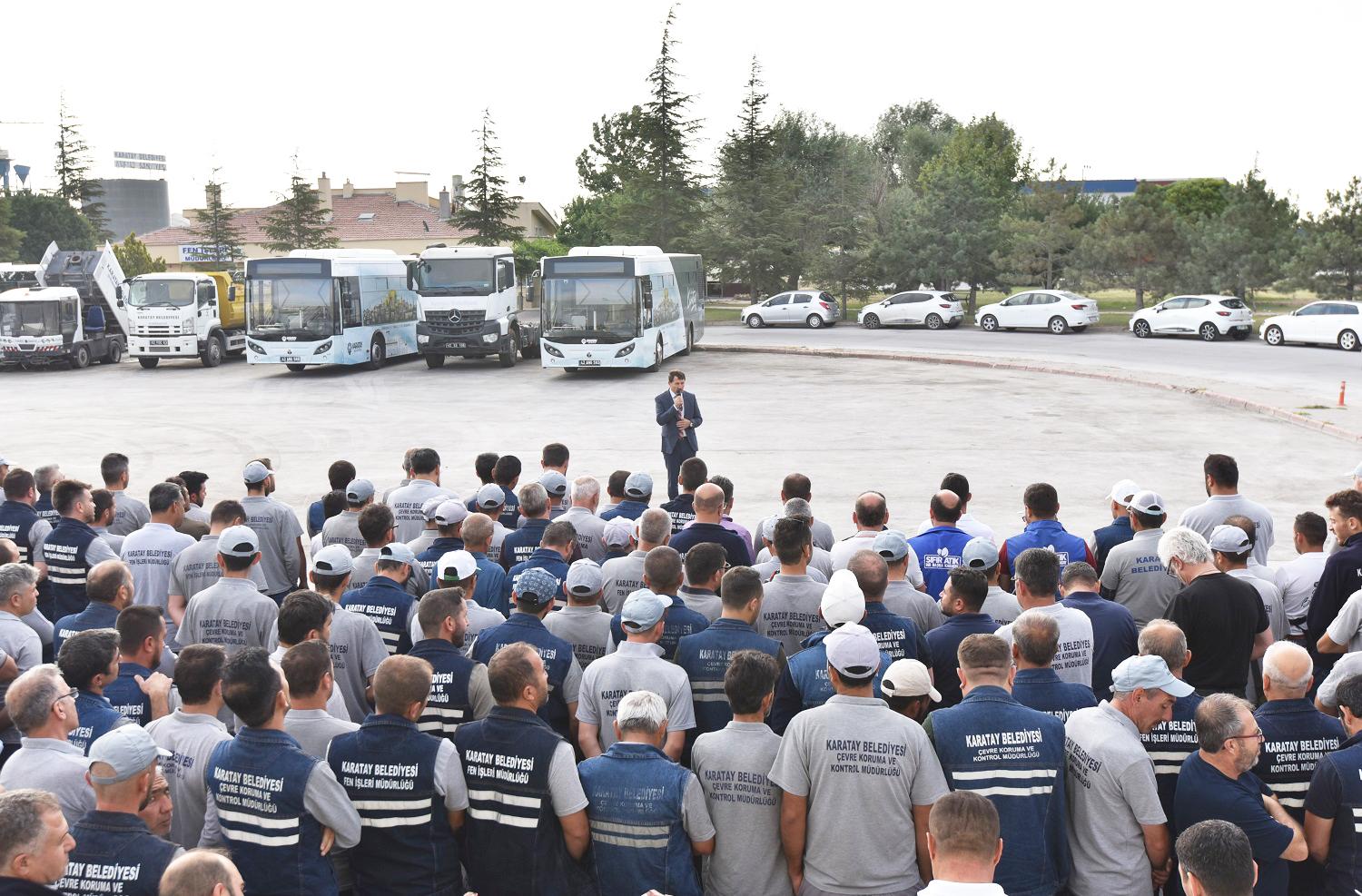 Böyle bir ekiple çalıştığı için çok mutlu olduğunu ifade eden Karatay Belediye Başkanı Hasan Kılca; “Bayramınızı en içten dileklerimle kutluyorum. Rabbim bizlere huzur, barış ve mutluluk içerisinde daha nice bayramlar nasip etsin inşallah. Bayramın heyecanını yaşamak, selamlaşmak ve tebessüm etmek için bir aradayız. Amacımız; hemşehrilerimizin daha rahat ve huzur içerisinde bir bayram yapmasına katkı sunmaktı. Bayram sürecince tüm saha ekiplerimiz, belediyecilik hizmetlerini aksatmadan yerine getirdi. Hepinizin emeklerine sağlık. Karatay’ımız kısa süre içerisinde büyük bir gelişme gösterdi. Türkiye’de en gelişmiş ilçe sıralamasında 200’üncü sırada olan belediyemiz bugün Ankara ve İstanbul’daki birçok ilçeyi geride bırakarak 80’inci sıraya yükseldi. Bu başarıda tüm personelimizin emeği ve alın teri var. Görevimiz ve sorumluluğumuz ağır, hiçbirimizin konumu, vazifesi basit değil. Hangi görevi yapıyorsak yapalım, biz hep birlikte Türkiye’yiz ve ülkemizin gelişmesine katkı sunacağız. Çocuklarımıza ve torunlarımıza güzel bir Karatay ve gelecek armağan etmek için üzerimize düşen sorumluluğu yerine getireceğiz daha çok çalışacağız. Bu süreçte emek veren ve alın teri döken tüm personelimizi kutluyorum. Karataylı hemşehrilerimiz her şeyin en iyisine en güzeline layık. Bizler, hemşehrilerimizin huzuru, mutluluğu ve refahı için ilçemize hizmet etmeye devam edeceğiz” diye konuştu.