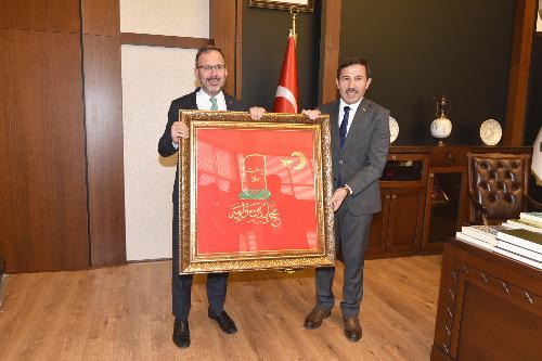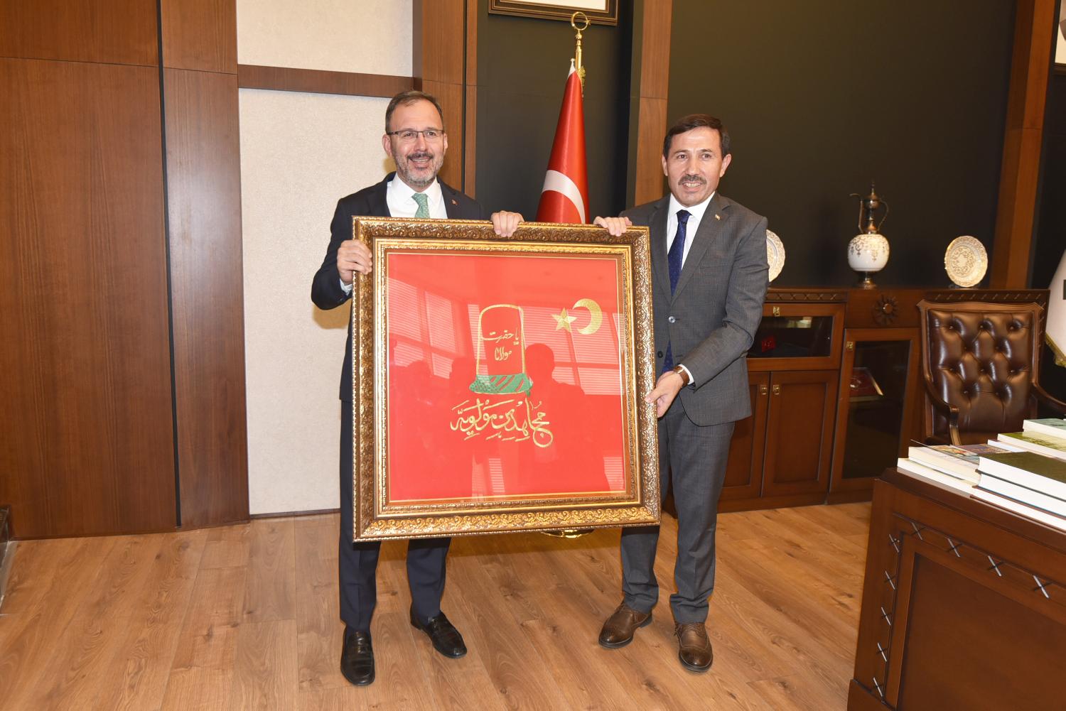 Karatay Belediye Başkanı Hasan Kılca, ziyaretin sonunda Gençlik ve Spor Bakanı Mehmet Muharrem Kasapoğlu’na Mevlevi Sancağı hediye etti.