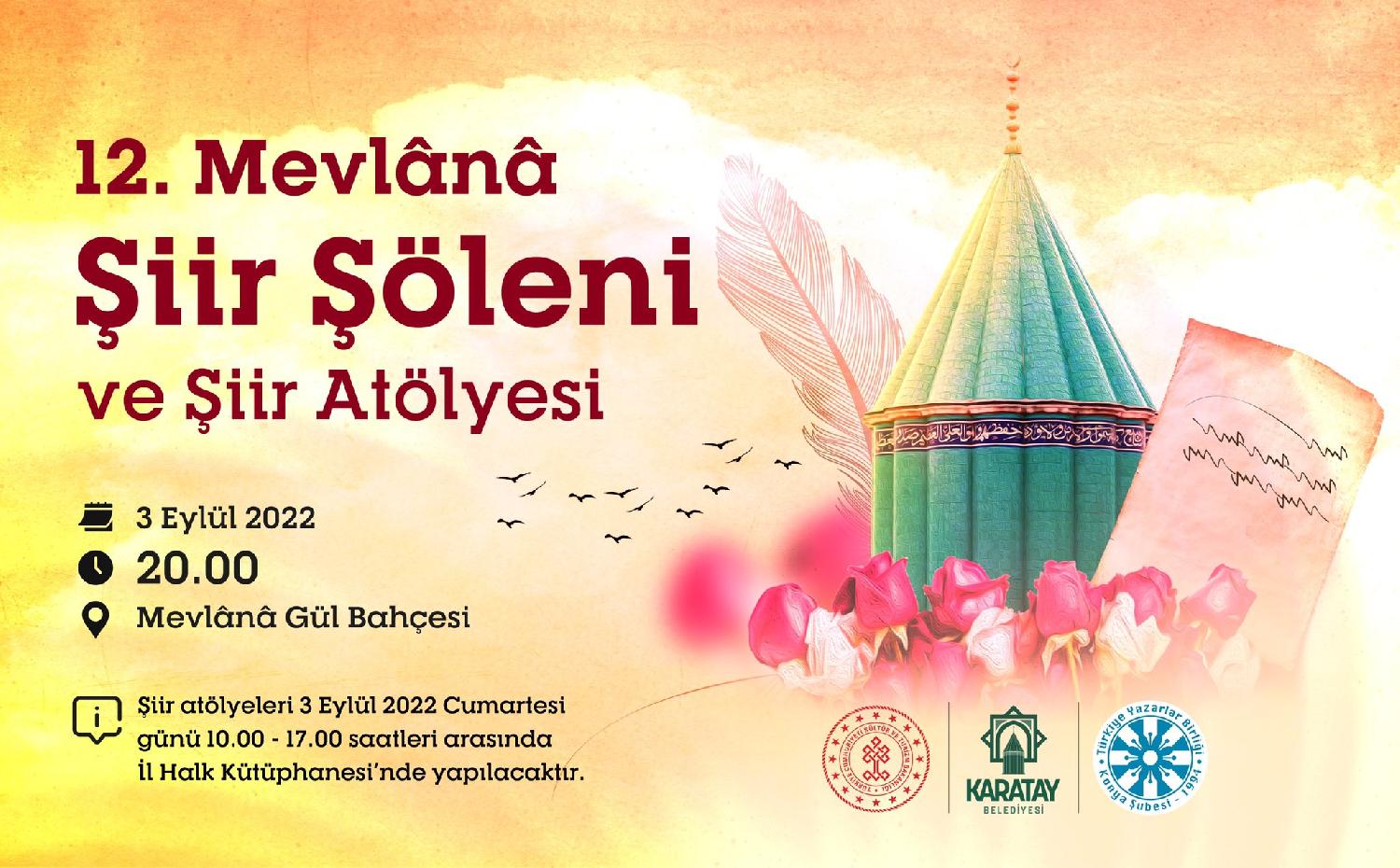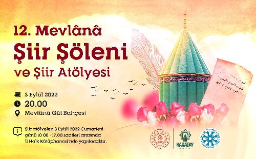 Karatay Belediyesi ile Türkiye Yazarlar Birliği Konya Şubesi’nin her yıl birlikte organize ettiği “12. Mevlânâ Şiir Şöleni ve Şiir Atölyesi ”, bu yıl da Türkiye’nin farklı şehirlerinden şairleri ve sanatseverleri Konya’da buluşturacak. Mevlânâ Şiir Şölenleri’nin Konya için çok önemli olduğunu vurgulayan Karatay Belediye Başkanı Hasan Kılca; “Medeniyet birikimimizle irtibatımızı asla koparmadan; ilim, fikir, hareketlerini desteklemeye şiire,edebiyata, sanata katkı vermeye gayret ediyoruz . Bu düşünceden hareketle tertip ettiğimiz şiir şölenine ,3 Eylül Cumartesi akşamı tüm hemşehrilerimizi, Türkiye’nin dört bir yanından gelecek olan değerli şairlerin kendi sesinden okuyacakları şiirleri dinlemeye Mevlânâ Dergahı Gül Bahçesine davet ediyorum” dedi.