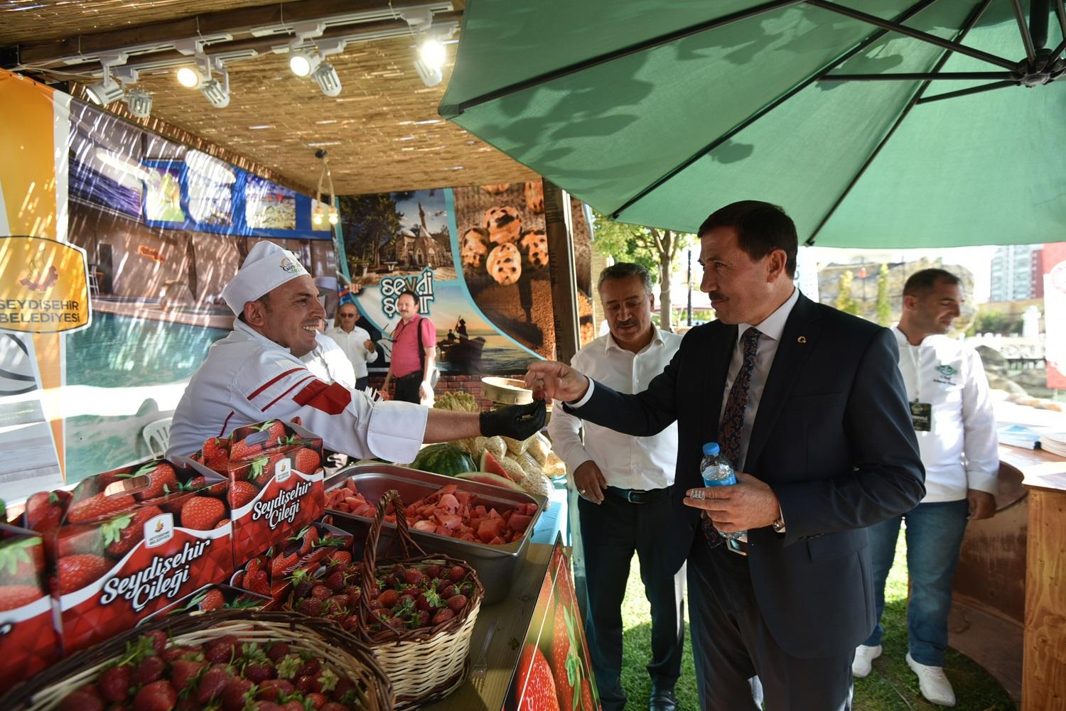 Karatay Belediye Başkanı Hasan Kılca da Konya GastroFest için Kalehan Ecdat Bahçesi’nde stant kuran kurum ve firmaları ziyaret ederek organizasyonun hayırlar getirmesi temennisinde bulundu.