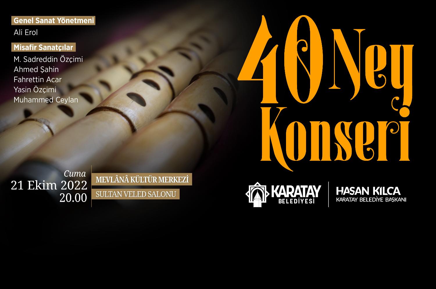Başkan Hasan Kılca; “Karatay Belediyesi olarak şehrimizde kültür ve sanat etkinlikleri düzenlemeye devam ediyoruz. Bu kapsamda 40 usta neyzenin yanı sıra önemli sazendelerden oluşan 44 kişilik dev bir kadro Konyalı hemşehrilerimize güzel bir akşam yaşatacaklar. 21 Ekim Cuma akşamı saat 20:00’da Mevlana Kültür Merkezi’ndeki bu unutulmaz geceye tüm Konyalı hemşehrilerimizi bekliyoruz” dedi.