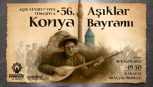 Türkiye’nin dört bir yanından 33 aşık ve halk ozanının yanı sıra Azerbaycan, Kırgızistan ve Irak’tan da üç halk ozanı, “56. Konya Aşıklar Bayramı”na katılacak. Program, 17 Kasım Perşembe günü saat: 11:00’da Karatay Belediye Başkanı Hasan Kılca’nın organizasyon hakkındaki basın açıklaması ve daha sonra yapılacak Mevlana Meydanı’ndaki açılış programıyla başlayacak. Türkiye’nin dört bir yanından organizasyona katılan halk ozanı ve aşıklar; aynı gün içerisinde Karatay Belediyesi önünde ve Kültür Park’ta; 18 Kasım Cuma günü ise Hükümet Meydanı ve Gedavet Yolu’nda kısa süreli açık alan gösterisi yapacak.