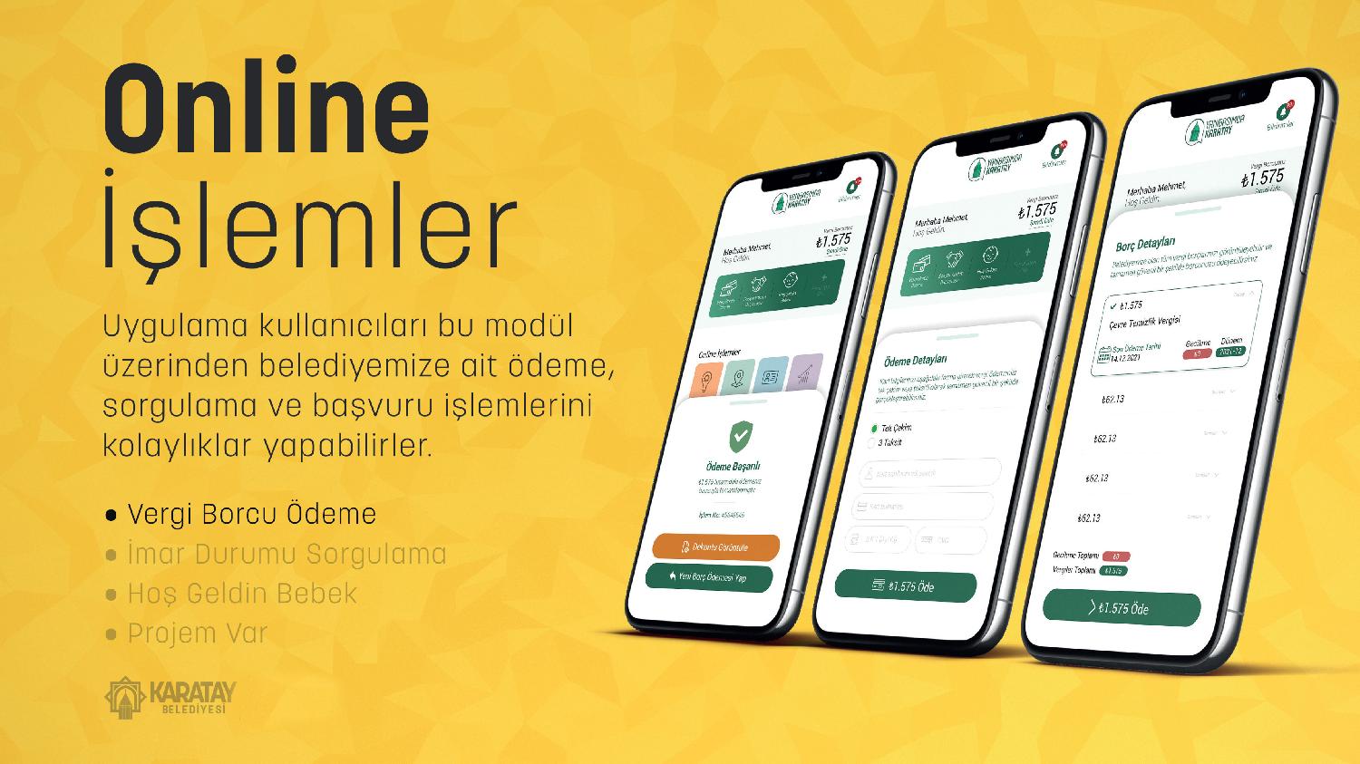 “Yanıbaşımda Karatay” mobil uygulaması vatandaşa birçok kolaylık sunuyor. Uygulamanın ‘Online İşlemler’ bölümünden belediyeye yapılabilen vergi borcu ödemeleri ve imar durumu sorgulaması yapılabiliyor. Bu sekmede ayrıca vatandaşlar “Hoşgeldin Bebek” başvurusunda bulunabiliyor. Yine ‘Online İşlemler’ sekmesi altında bulunan “Projem Var”a tıklayan vatandaşlar, Karatay ile ilgili her türlü fikri veya projesini yükleyebiliyor.