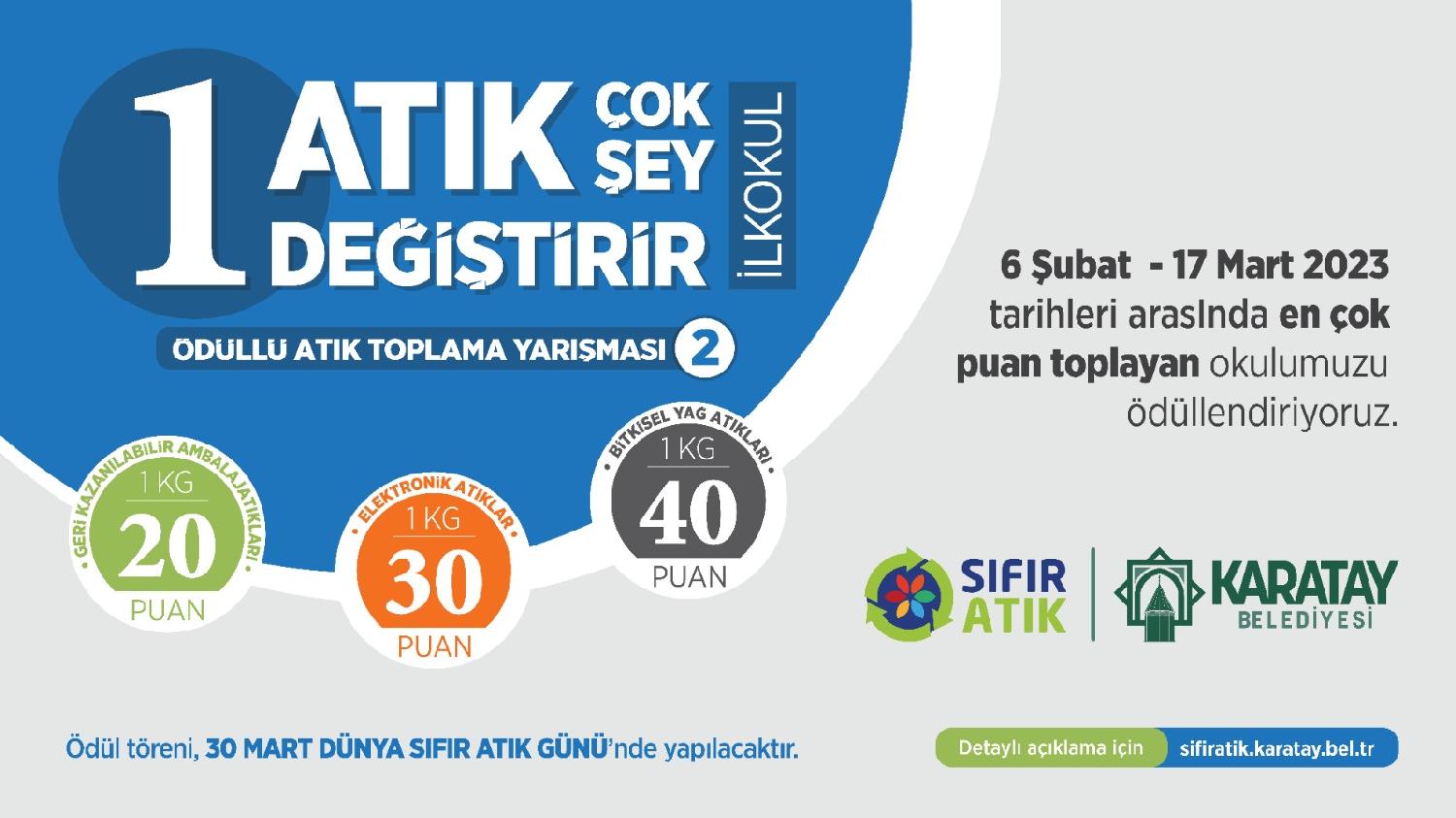 Karatay Belediyesi tarafından düzenlenen “İlkokullar Arası Atık Toplama Yarışması”nın 2’ncisi başladı. İlkokul öğrencileri arasında Sıfır Atık ve geri dönüşüm bilincinin pekişmesi, atıkların çevre ile insan sağlığına verdiği zararlarını etkili bir şekilde anlatılması ve onlarda çevre bilincinin kazanılabilmesi amacıyla yapılan yarışma için “1 Atık Çok Şey Değiştirir” sloganı belirlenirken yarışmada dereceye girenleri önemli ödüller ve birbirinden güzel sürprizler bekliyor.