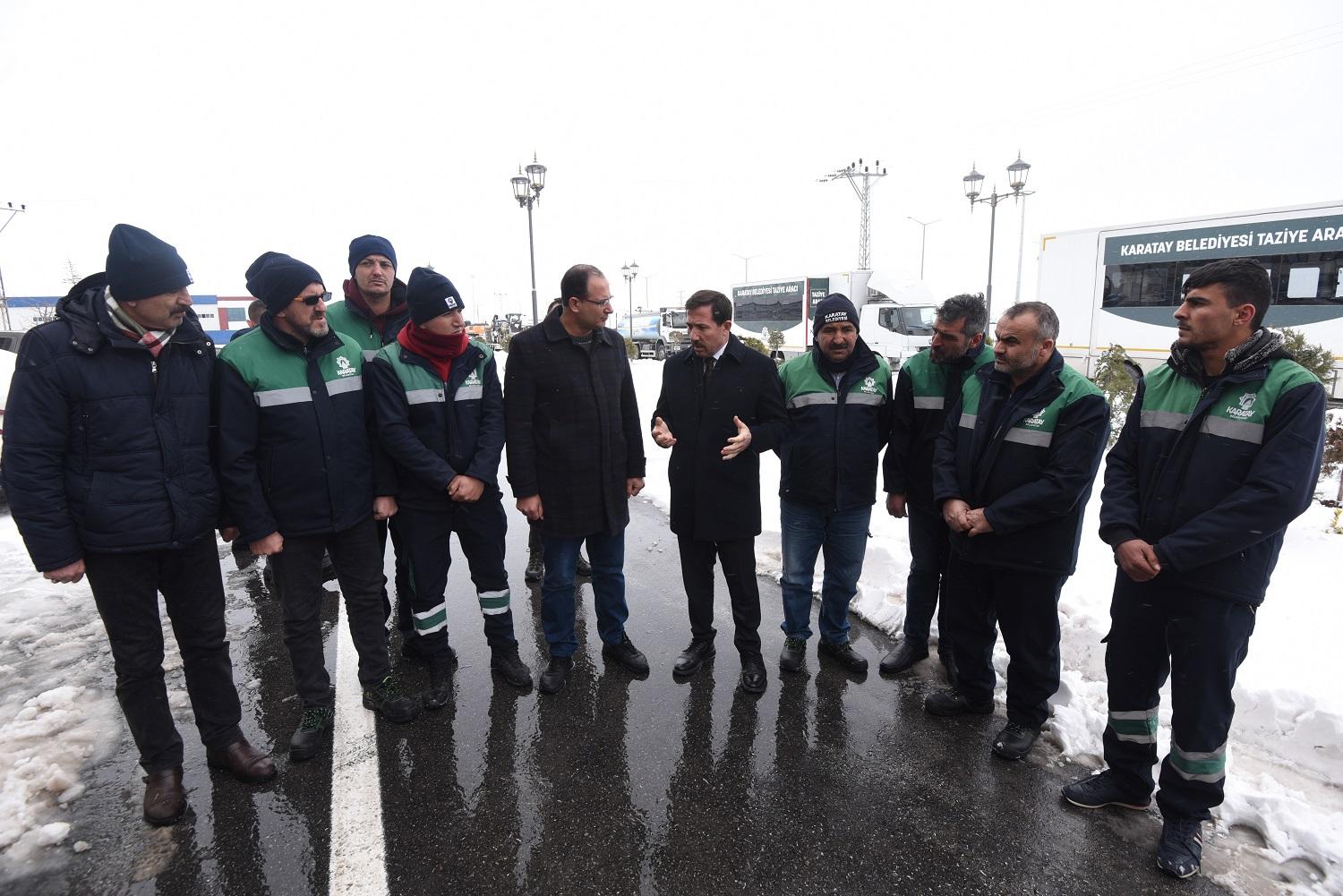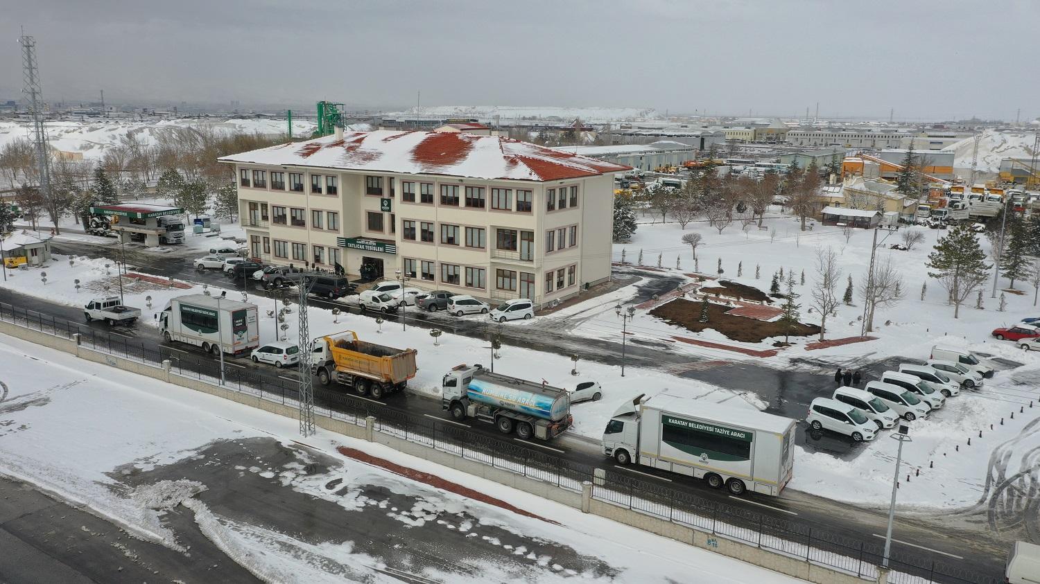 Karatay Belediyesi de olası afet durumları için gerekli tüm hazırlığını yaptı. Belediye tarafından hazırlanan araçlar, yardım malzemeleri, ekipman ve birçok personel hemen bölgeye hareket etti.