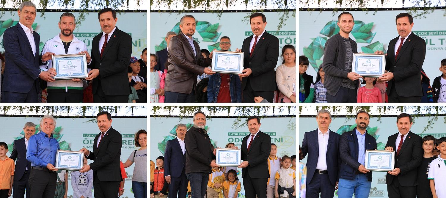 Konuşmaların ardından “1 Atık Çok Şeyi Değiştirir Atık Toplama Yarışması 2” de dereceye giren okullara belgeleri ve ödülleri, Karatay Belediye Başkanı Hasan Kılca ile Karatay İlçe Milli Eğitim Müdürü Sami Sağdıç tarafından verildi.