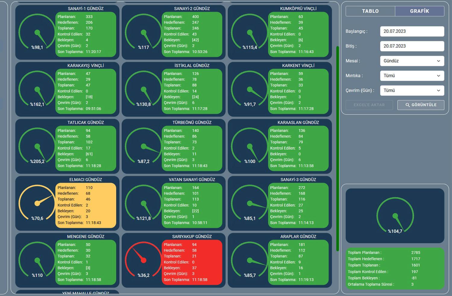 Akıllı Atık Toplama ve Yönetim Sistemi kapsamında ilçe genelindeki çöp konteynerlerinin sayısını ve türlerini dijital ortama aktardı. Sistemle çöp konteynerinin en son ne zaman, hangi araçla ve hangi vardiyada alındığı gibi daha birçok bilgiye kolayca ulaşılabiliyor. İlçedeki konteynerler, alınma döngüleriyle birlikte çöp toplama hizmetlerinin performansı izlenebiliyor ve duruma göre iyileştirmeler yapılabiliyor. Bu sayede vatandaştan gelen taleplerin de çok daha hızlı çözüme kavuşturulması sağlanmış oluyor.