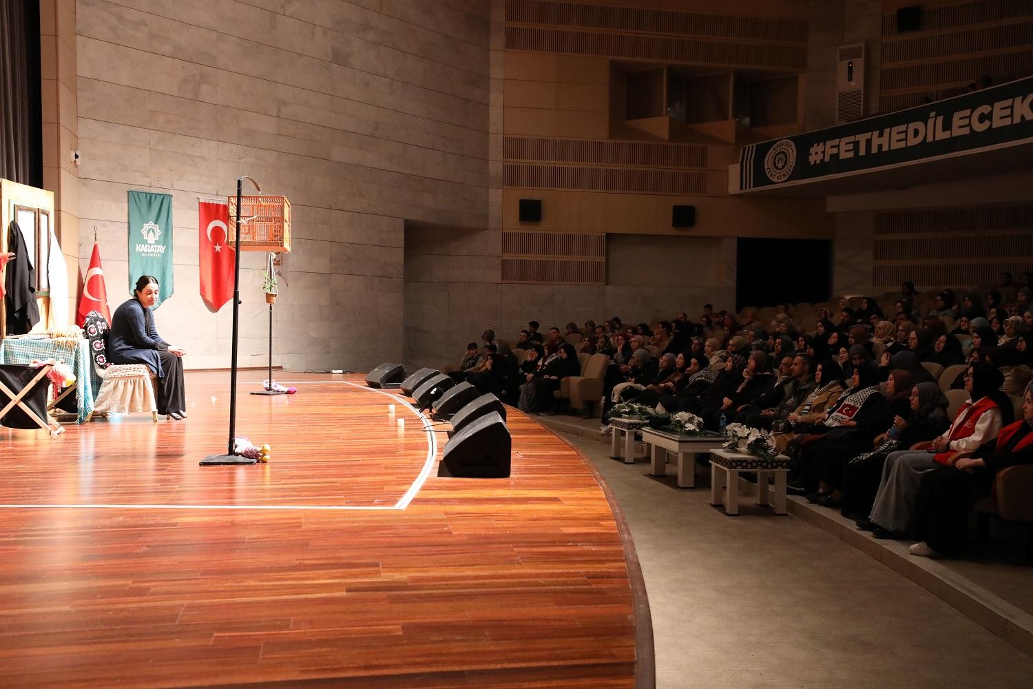 Filistin meselesini Filistinli bir kadının hikâyesi üzerinden tiyatroyla anlatıldığı “Filistin Hakkında Konuşmalıyız” adlı oyun, Karatay Kent Konseyi Kadim Kudüs Çalışma Grubu’nun koordinasyonuyla Konyalı tiyatro severlerle buluştu.