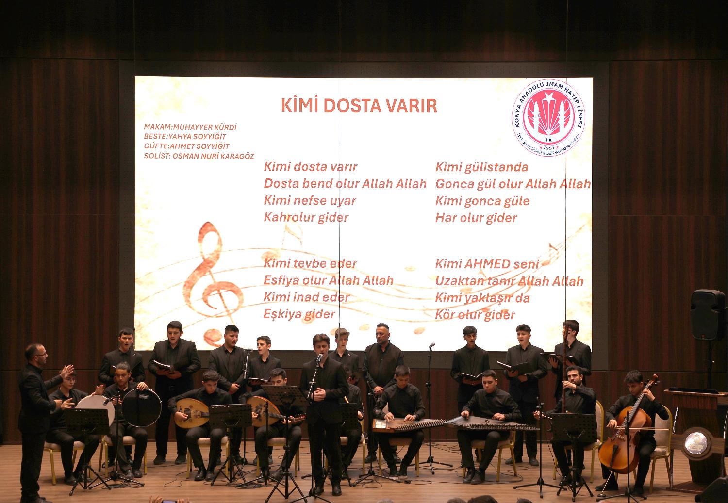 Karatay Belediye Başkan Vekili Mevlüt Kanat, Karatay İlçe Milli Eğitim Müdürü Sami Sağdıç, Konya Anadolu İmam Hatip Lisesi idarecileri, öğretmen ile Konyalı sanatseverlerin ilgi gösterdiği konserde okul korosu; “Kimi Dosta Varır”, “Uyan Ey Gözlerim Gafletten Uyan, “Ben Yürürüm Yane Yane” ve “Vakt-i Seher” gibi daha birçok birbirinden kıymetli eseri seslendirdi.