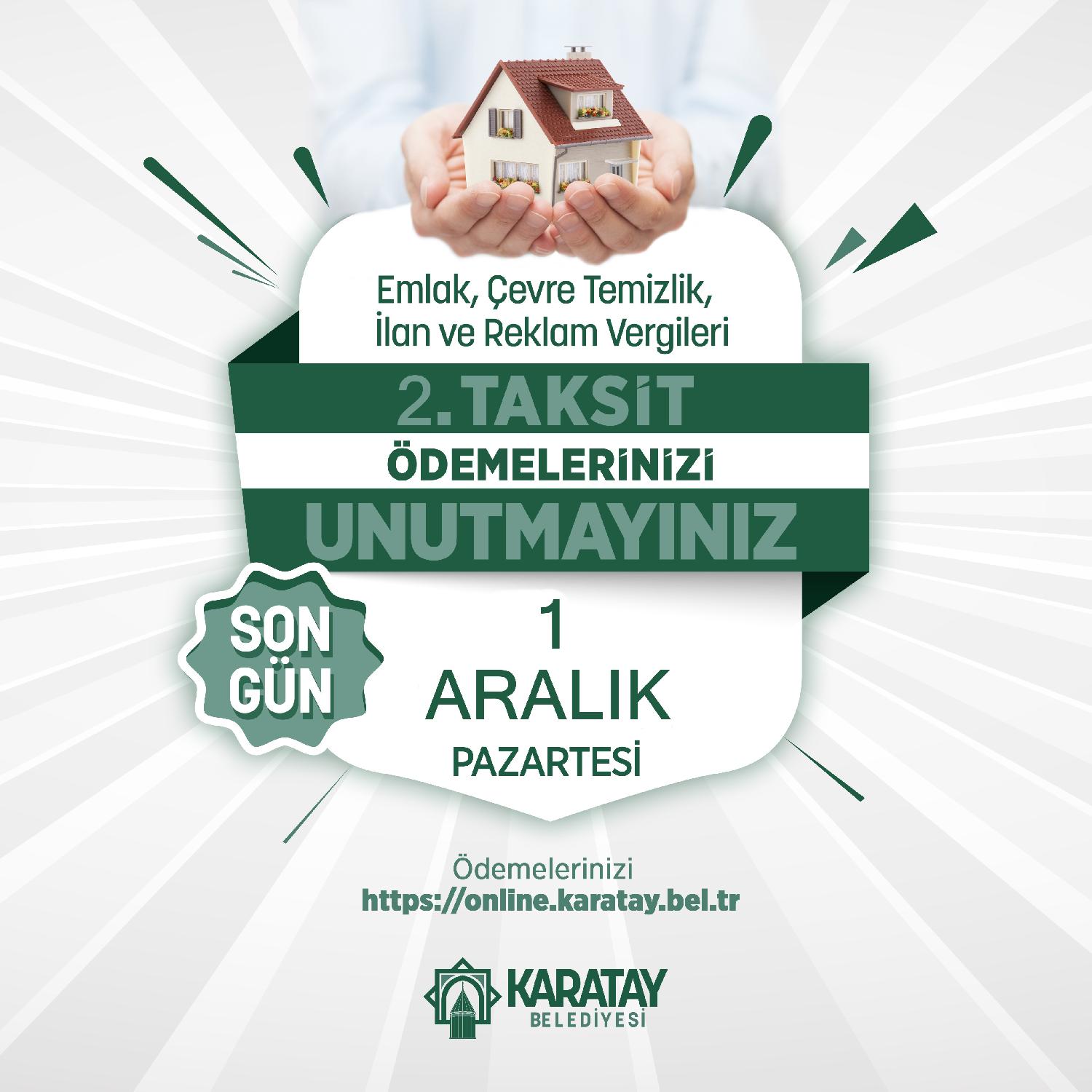 Açıklamada şu ifadelere yer verildi: “Vatandaşlarımız, 1 Aralık 2025 Pazartesi günü mesai bitimine kadar emlak, çevre temizlik ve ilan-reklam vergilerinin ikinci ve son taksitlerini; T.C. kimlik numarası veya mükellef sicil numarası ile Karatay Belediyesi hizmet binasındaki veznelere nakit veya kredi kartı ile ödeyebileceklerdir. Ayrıca ödemeler, https://online.karatay.bel.tr/#/odeme-islemleri/odeme-islemleri adresi üzerinden ve Karatay mobil uygulaması aracılığıyla kredi kartı veya banka kartı ile de yapılabilmektedir. Mükelleflerimizin gecikme zammına maruz kalmamaları ve herhangi bir mağduriyet yaşamamaları için ödemelerini süresi içinde tamamlamaları önemle rica olunur. Süresi içinde ödenmeyen vergilere, 6183 sayılı kanun gereğince gecikme zammı uygulanmaktadır.”