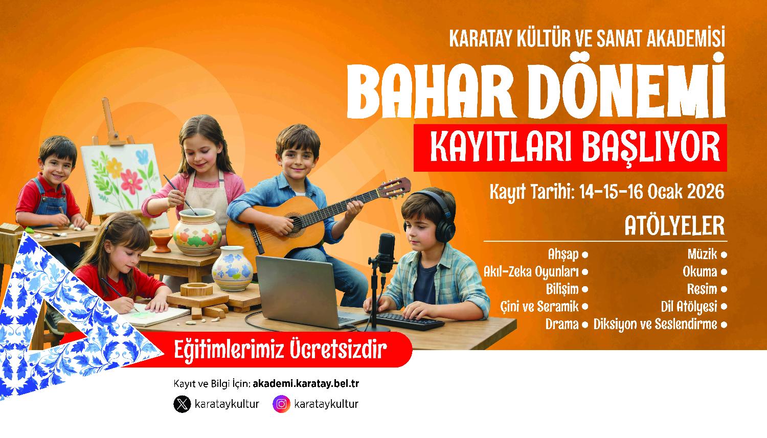 Karatay Kültür ve Sanat Akademisi, Bahar Dönemi kapsamında çocukları ve gençleri farklı alanlarda hazırlanan zengin atölye programlarıyla buluşturacak. Akademi bünyesinde; Ahşap, Akıl ve Zeka Oyunları, Bilişim, Çini ve Seramik, Drama, Müzik, Okuma, Resim, Dil Atölyesi ile Diksiyon ve Seslendirme alanlarında eğitimler verilecek.